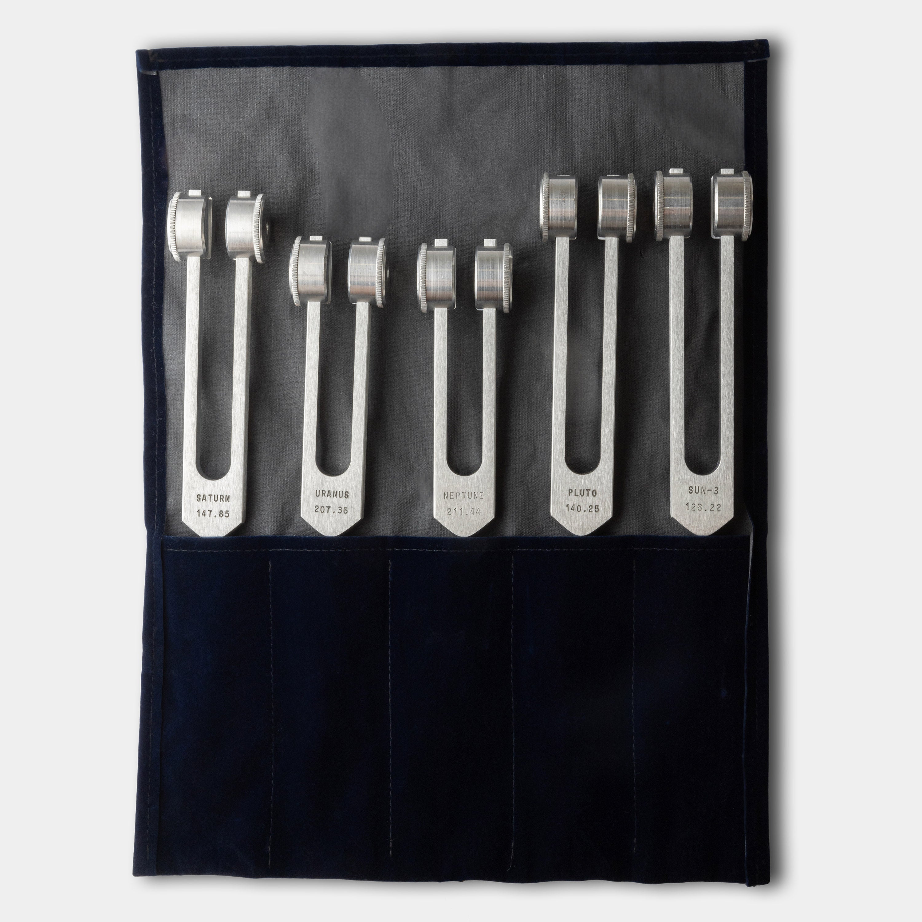 Choose individual Planetary Tuners for your life now or buy a whole set. Each Planetary Tuner is labeled on the tuning fork with the name of the planet and the exact vibrations per second of the tuning fork and the full set comes in two felt pouches.